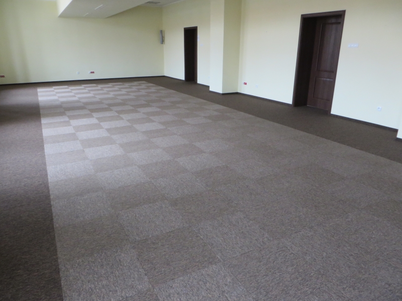 Ułożyliśmy płytki dywanowe Burmatex Tivoli w dwóch kolorach. Efekt na zdjęciach.